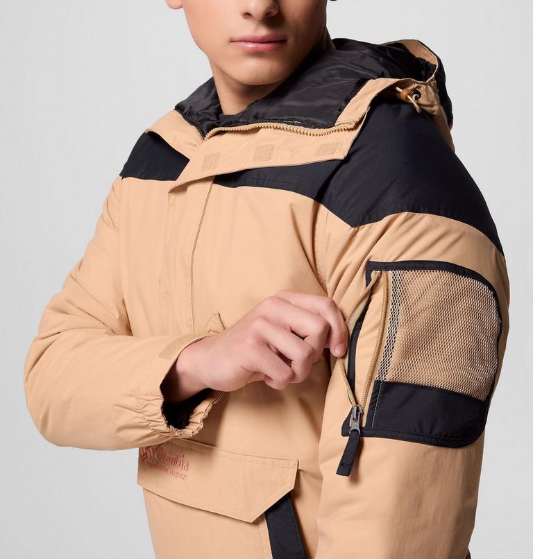 Challenge the elements and revive the 90s with this lightweight water-resistant pullover jacket in a retro-inspired design. Featuring an oversized pocket at the front, a colourblock design and the Columbia logo embroidered on the hood, this style pays tribute to our original sportswear jackets from the nineties. It will keep you warm, dry and comfortable during your outdoor adventures.